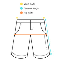- Waist – Measure across the waistband from one side to the other while the shorts are laid flat. This is half of the total waist measurement.